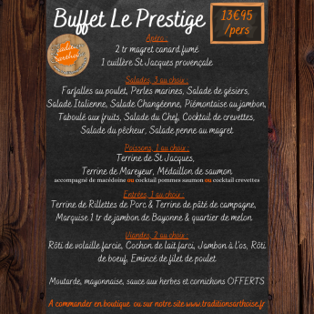 Découvrez également notre offre complète de buffets froids réalisés par notre artisan charcutier-traiteur, pour varier les plaisirs et répondre à toutes les occasions. Chez Traditions Sarthoise, chaque prestation est conçue avec passion et exigence, pour faire de votre événement un moment savoureux et inoubliable.