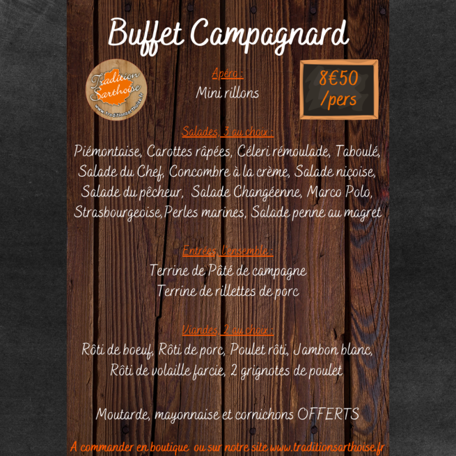 Idéal pour vos événements privés ou professionnels — mariage, anniversaire, séminaire, repas associatif ou cousinade — notre buffet campagnard conjugue convivialité et qualité. Il est composé de spécialités charcutières artisanales, comme les rillettes du Mans, le jambon persillé, les saucissons secs maison ou encore le pâté de campagne, accompagnées de salades composées, crudités fraîches, fromages de terroir et pains variés.