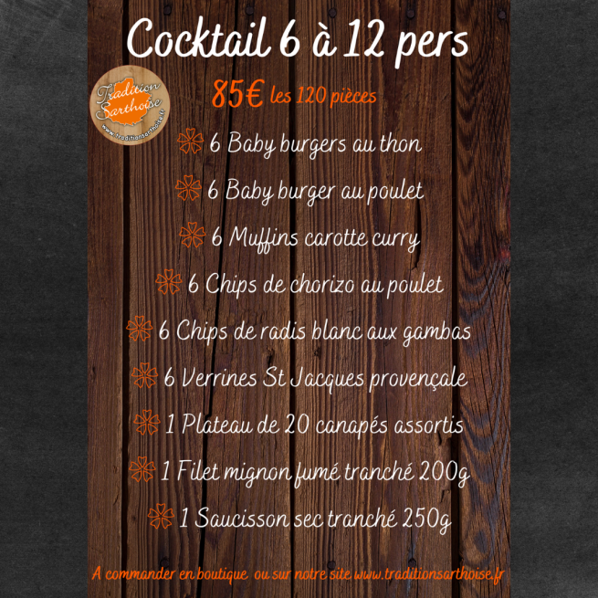 Pour vos repas en petit comité, Tradition Sarthoise, maître artisan boucher charcutier traiteur au Mans, propose une formule cocktail dînatoire pour 6 à 12 personnes, alliant originalité, gourmandise et produits de qualité. Conçu dans notre laboratoire à partir d'ingrédients locaux, ce cocktail est idéal pour les événements privés comme les rendez-vous professionnels intimistes.