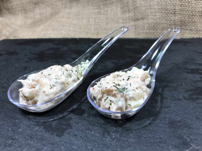 La cuillère de saumon Label Rouge aux pommes croquantes est une création artisanale conçue par Tradition Sarthoise, artisan boucher et traiteur au Mans. Parfaite pour sublimer vos apéritifs et vos réceptions, cette spécialité allie la douceur et la finesse du saumon à la fraîcheur acidulée des pommes croquantes. Une bouchée délicate qui surprendra vos convives par son équilibre parfait.