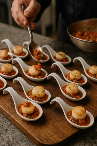 Imaginez une cuillère apéritive délicate, où une noix de saint-jacques juste snackée, à la chair nacrée et tendre, se pare des couleurs et des parfums du sud. C'est la promesse d'une escapade gourmande, une création qui allie la finesse de l'océan à la chaleur de la provence. Le parfum subtil de l'ail, de la tomate confite et des herbes fraîches s'élève, évoquant instantanément la convivialité et le partage. Cette bouchée, issue d'une recette traditionnelle revisitée, est l'expression même du savoir-faire sarthois : l'art de transformer des produits d'exception en un moment de pur plaisir. En bouche, la texture fondante du coquillage contraste avec le fondant des légumes, créant une harmonie parfaite. C’est dans cette simplicité raffinée que réside toute l'élégance d'une fabrication artisanale, pensée pour célébrer l'art de l'apéritif, si cher à notre région.