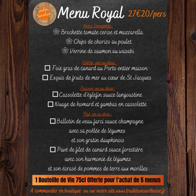 Pour vos repas de fête, nous avons le plaisir de vous proposer notre menu Royal, élaboré avec soin par notre maître artisan boucher traiteur, Tradition Sarthoise. En choisissant de commander votre repas chez nous, vous êtes assurés de déguster des viandes de qualité, issues d'élevages locaux et travaillées avec passion par notre artisan.