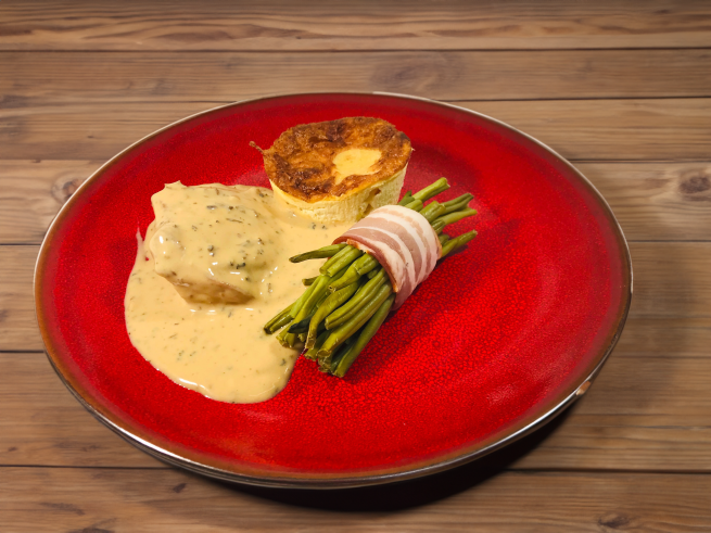Flan aux légumes frais (carotte, céléri, courgette) - Fagot de haricots lardés - Poêlée de légumes (Chou-fleur, oignons, carottes, brocoli) - Timbale de riz - Ecrasé de pommes de terre à la crème - Gratin dauphinois à la crème - Pommes de terre grenailles au sel de Guérande - Pommes paillassons - Pommes dauphinois