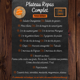 Votre traiteur Le Mans Tradition Sarthoise vous propose un service de plateaux-repas à venir retirer au magasin. Plusieurs options sont possibles dans chaque menu de plateaux-repas proposés. Vous aurez aussi la possibilité de choisir entre un plateau-repas de base, qui reprend des spécialités françaises classique ou le plateau-repas Sarthois Complet, qui lui propose des recettes bien de chez nous.