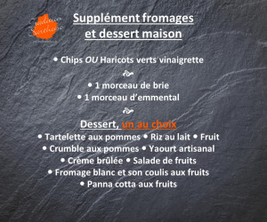 Le Supplément Fromages et Dessert Maison allie simplicité et qualité. Il se compose d’un accompagnement au choix entre chips ou haricots verts vinaigrette, suivi d’un duo de fromages incontournables : un morceau de brie et un morceau d’emmental. Pour clore le repas en douceur, vous pourrez choisir un dessert parmi une sélection maison : tartelette aux pommes, riz au lait, fruit frais, crumble, yaourt artisanal, crème brûlée, salade de fruits, fromage blanc au coulis de fruits ou panna cotta. Un moment sucré qui met en valeur le savoir-faire artisanal de notre maison.