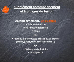 Notre Supplément Accompagnement et Fromages du Terroir met à l’honneur la richesse de notre région. Il inclut un accompagnement au choix : taboulé maison, haricots vinaigrette ou chips. Il est suivi d’un plateau de fromages artisanaux sarthois - chèvre, gouda, tome ou vache affinée – sélectionnés auprès de producteurs locaux. Une salade verte fraîche et sa vinaigrette complètent l’ensemble pour une assiette équilibrée et savoureuse.