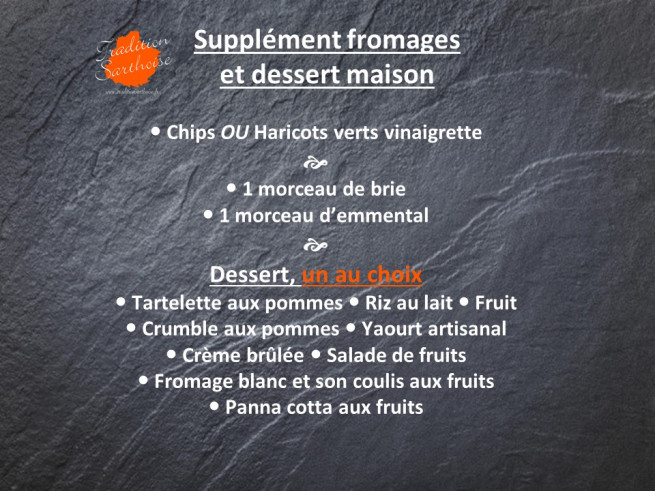 Pour terminer le repas sur une note sucrée, Tradition Sarthoise vous propose un dessert à choisir parmi une sélection artisanale préparée dans notre laboratoire. Tartelette aux pommes, riz au lait, fruit frais, crumble aux pommes, yaourt artisanal, crème brûlée, salade de fruits, fromage blanc au coulis de fruits ou encore panna cotta : autant de douceurs qui satisferont toutes les envies.