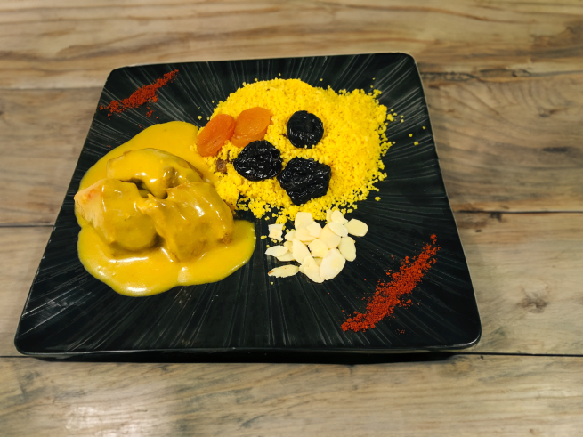Laissez-vous transporter par les saveurs orientales de notre tajine de poulet aux fruits secs et semoule, une recette authentique préparée avec passion par votre maître artisan boucher, Tradition Sarthoise. Nous sélectionnons rigoureusement des poulets d'origine locale et des ingrédients frais pour vous garantir un plat savoureux et de grande qualité.
