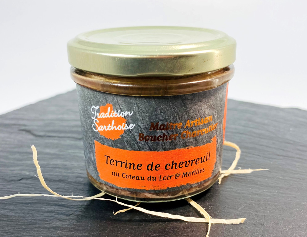 viande de chevreuil (collier/poitrine) origine France, gorge de porc fermier label rouge de la sarthe, foie de volaille, œuf entier, porc - couenne cuite, vin rouge coteau du loir, poitrine de porc fermier label rouge de la sarthe, cognac, morilles entières, fécule de pomme de terre, protéines de lait HV, sel fin, thym, poivre blanc